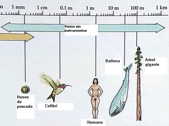 dibujos que muestran la escala de los diversos seres vivos,las dimensiones y los instrumentos utilizados para