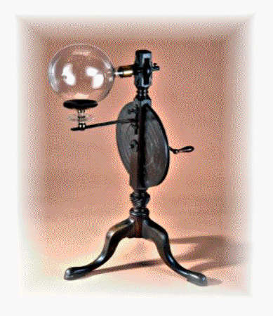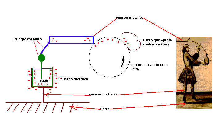 Pieter van Musschenbroek,profesor de matematica y fisica de la Universidad de Leyden en Holanda,experimentaba con la electricidad con un una maquina de friccion construida con una esfera de vidrio como la mostrada a continuacion,observe el lector que mientras la esfera gira en la parte inferior hay una tela que hace friccion contra la misma generando una carga electrica.