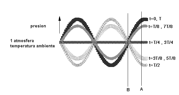 el siguiente grafico indica la variacion de presion a lo largo del tubo de resonancia varias veces dentro de un ciclo (el periodo de la onda acustica es T). El tubo tiene un largo 1,7m y un diametro de 0,3m, esta abierto en el extremo del altavoz, y cerrado en el otro extremo. Se muestra el tercer modo de resonancia, la frecuencia es de 260 hertzios.