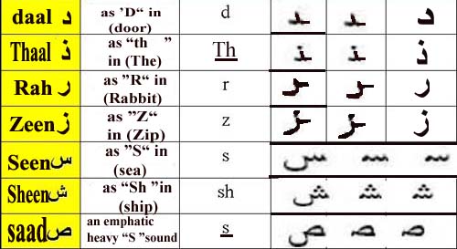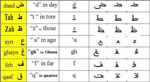 7-the following letters should always be given the correct stress: Saad,Daad,Tah,Zah 8- the English following sounds have no equivalent in Arabic:V & P.
