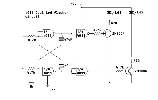 | This simple circuit uses NAND Gates to alternately flash two led's. The two 47uF capacitors determine the flash frequency. It is a good idea to use a decoupling capacitor across the power supply. I made this circuit using the components shown and it worked fine. The IC that I used is the 4011 Quad 2-input NAND Gate. If you have any questions about this circuit or any other circuit on my website then you can Email me. |