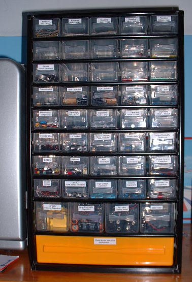 This is where I keep all my electronic components so I can find the right ones whenever I wish. Eash draw contains components grouped into certain categeries e.g. NPN transistors in one draw and PNP in another. It is good that I don't always have to go to Maplin or order from farnell whenever I need components. |