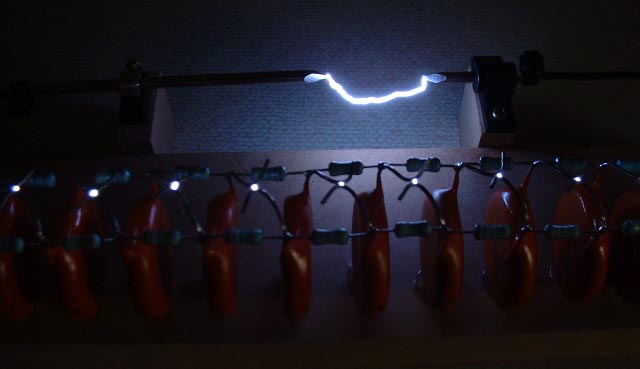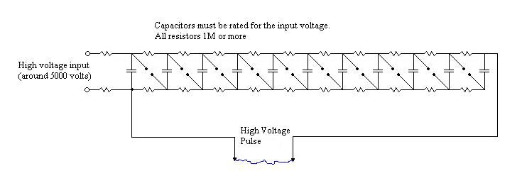 A marx generator is a clever way of charging up a number of capacitors in parallel and discharging them in series. The output voltage is the voltage in each of the capacitors multiplied by the number of stages. The Cascade multiplier uses diodes and capacitors to multiply the voltage whereas the marx generator uses resistors to charge the capacitors and spark gaps to discharge them. When the voltages in the capacitors are high enough to trigger the spark gaps, the capacitors are instantly connected in series resulting in the voltages in the capacitors adding up to produce very large outputs. The resistors connect the charging supply to the resistors but limit the capacitors discharge rate during spark gap conduction. In order for the marx generator to function, the spark gaps must all fire in less time than it would take for any single capacitor to discharge through it's resistors. Fortunately, spark gaps reach maximum conductance in about 10 nanoseconds. |