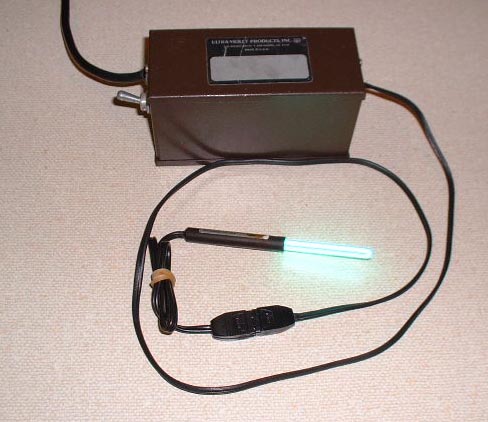 | Neon sign transformers provide the high voltages needed to operate neon tubes. Outputs can range from 3kV at 5mA to 15kV at 100mA. The transformer shown here isn't strictly a neon sign transformer. It provides the high voltage needed to operate the high energy UV light shown in the picture. The output probably is in the region of 5kV at 10mA. Neon sign transformers are very similair to the one shown here. | ||||||