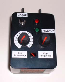 This is my latest electric shocker circuit that I have designed. The advantages with this circuit are that it has variable output current and two ranges of frequency adjustment. When the 10uF capacitor is used the frequency is variable from 15Hz to 2Hz and when the 10nf capacitor is used the frequency is variable from 2kHz to 15kHz. The green led is to show when main power is on and the red led is to show when the circuit is in operation. The transformer used can be any mains transformer with a 240 - 3v, 240 - 6v or 240 - 9v rating. The transformer is used in reverse. |