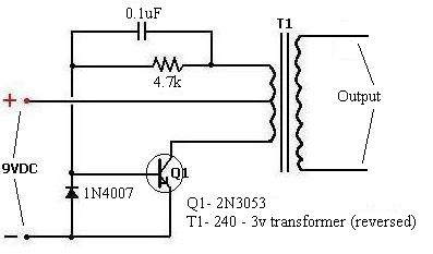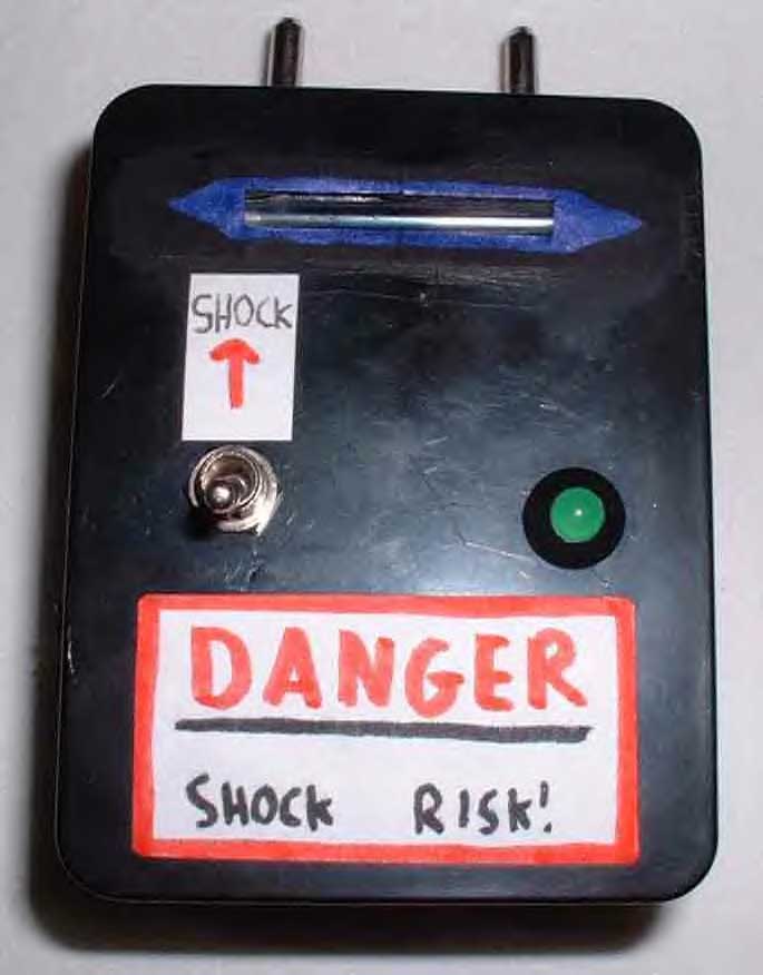 | This is one of my electric shockers. The circuit for it shown below. It is a simple, one transistor design. There is a flash tube at the top of the shocker which has lots of sparks through it to show when the shocker is in operation. The output is enough to give a painful jolt and is nearly impossible to hold on to for more than a second. This shocker was made for fun so that I could shock friends. It is completly safe and the output from it is nothing like a stungun. Stunguns have outputs of 50kV + and are capable of temporarily paralizing whoever is unlucky enough to get shocked by one. |