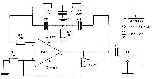 Este oscilador com amplificador operacional produz senoides em uma faixa de frequência que depende dos valores dos componentes utilizados. junto ao diagrama esta formula utilizada para determinar os valores dos componentes em função da frequência. A fonte para alimentar o circuito deve ser simétrica com tensoes entre 9 e 15V.