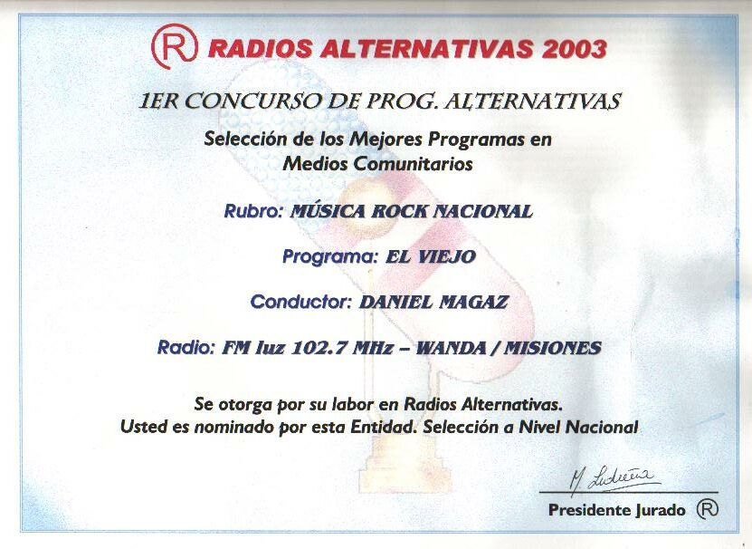 Programa galardonado en el rubro "PROGRAMA DE MUSICA DE ROCK NACIONAL" con el premio de RADIOS ALTERNATIVAS 2003