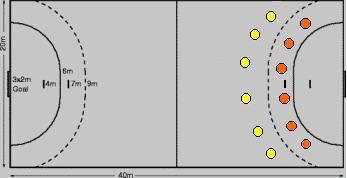 SISTEMA DE MARCAÇÃO POR ZONA: Na marcação por zona, ao contrário, cada jogador é responsável por uma zona em seu campo de defesa, entre as linhas da área de goleiro e as de tiro livre, devendo marcar todos os jogadores que passem por sua zona. Na marcação por zona, quando um jogador sai para interceptar um arremesso, outro jogador se desloca para dar-lhe a devida proteção, cobrindo sua zona, a fim de evitar um vazio na defesa. Dependendo da necessidade, os jogadores auxiliam-se mutuamente, fazendo coberturas de posição. Para que a defesa da equipe funcione, é necessário que cada jogador saiba o que fazer individualmente. SISTEMA DEFENSIVO POR ZONA 3 X 3: Sistema defensivo limitado, mas que proporciona aos iniciantes melhores possibilidades de um aprimoramento de suas habilidades individuais. Temos nesse sistema duas linhas de três jogadores, que não ficam na mesma linha.