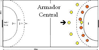 O Armador CentralÉ a "locomotiva" do time no ataque. Este jogador está no centro do ataque e comanda o curso e o tempo do mesmo, deve saber arremessar com força e ter um grande repertório de passes. Deve possuir grande visão de jogo para se adaptar as mudanças na defesa adversária. Força, concentração, tempo de jogo e passes certos são o que destacam um bom armador. O armador pode ser um pouco mais baixo, porém deverá ter grande habilidade e agilidade. É de grande significância que ele tenha experiência e maturidade de jogo, pois cabe, principalmente, a ele, as armações e organizações das jogadas da sua equipe. E ainda, deve servir de exemplo de técnica e equilíbrio psicológico para toda a sua equipe.