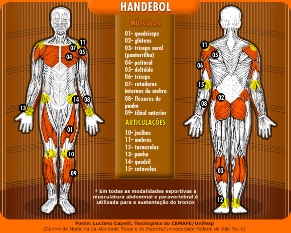 Contra-Ataque É uma jogada rápida, que constitui a melhor maneira de se chegar ao gol do adversário, pois, quando perde a bola, o ataque adversário nem sempre consegue se organizar para a defesa. Existem vários sistemas de contra-ataque. Citaremos dois deles: o contra-ataque direto e o contra-ataque sustentado. CONTRA-ATAQUE DIRETO: Acontece quando, num passe longo, o jogador que recebe a bola sai em velocidade para a quadra do adversário. CONTRA-ATAQUE SUSTENTADO: Quando mais de um jogador sai do seu campo defensivo par o ataque em velocidade, fazendo passes, sem que os defensores tenham condições de se organizar para a defesa. MÚSCULOS TRABALHADOS NO HANDEBOL