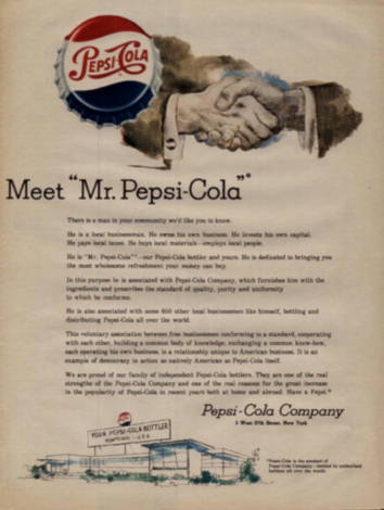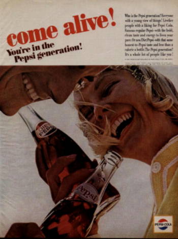 | Above you will see two Pepsi ads from the 1950's. One for Pepsi and one for Diet Pepsi. As you can see these two ads are very different from the video ad above. In the 1950's all that was available was Pepsi and Diet Pepsi. Now you can purchase Pepsi, Diet Pepsi, Pepsi Twist and Diet Pepsi Twist. | ||||||||||||||||
