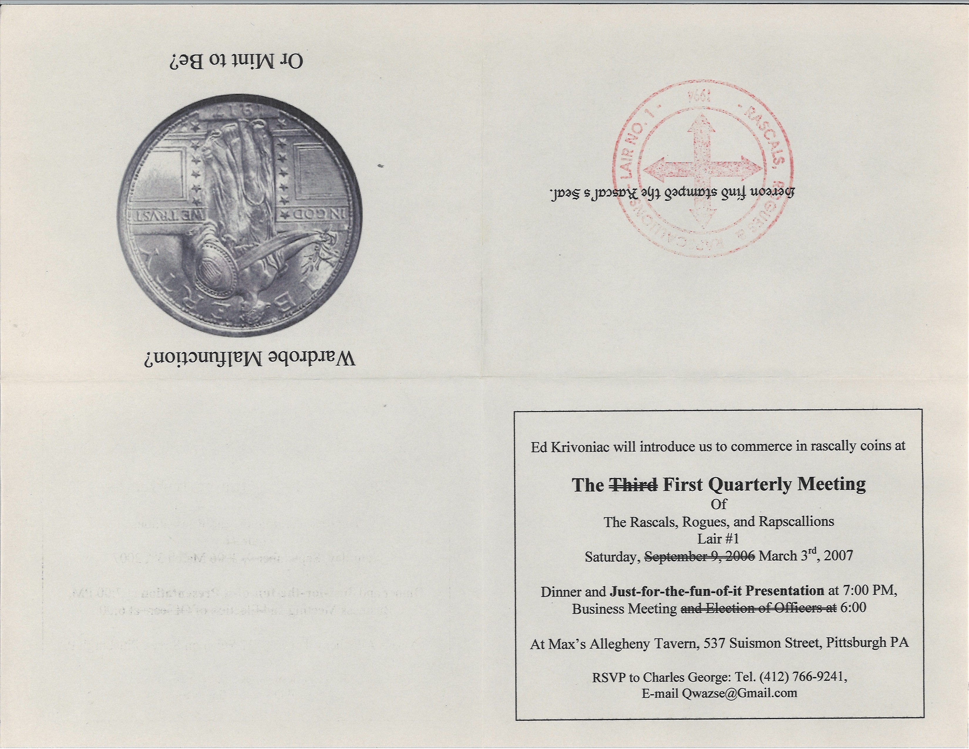 A meeting of Lair No. 1 was called on March 3, 2007 at Max's Allegheny Tavern for a presentation from Ed Krivoniak concerning Rascal coins. This was rescheduled from the Third Quarter of 2006. We have no confirmed reports if this meeting happened or who attended. Below is the invitation that exists in the Ephorate's Archive. While Ed Krivoniak is not a member of the RR&R, he certainly is a well-known numismatist in western Pennsylvania.
