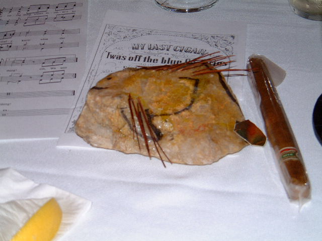 There was some spread in the voting, but Ron DiOrio won the Landgraf Prize handily with his defense of Mylodon. He will be buying drinks for Charlei George, who won a squeaker over Mark Miller for the McGeoy Bitter Cup. The Wrasse School Quartet have been booked for the Ball, as has Mark’s channeling guitar. Mylodon awaits discovery or cloning, but is the Mascot of Lair Number One!!