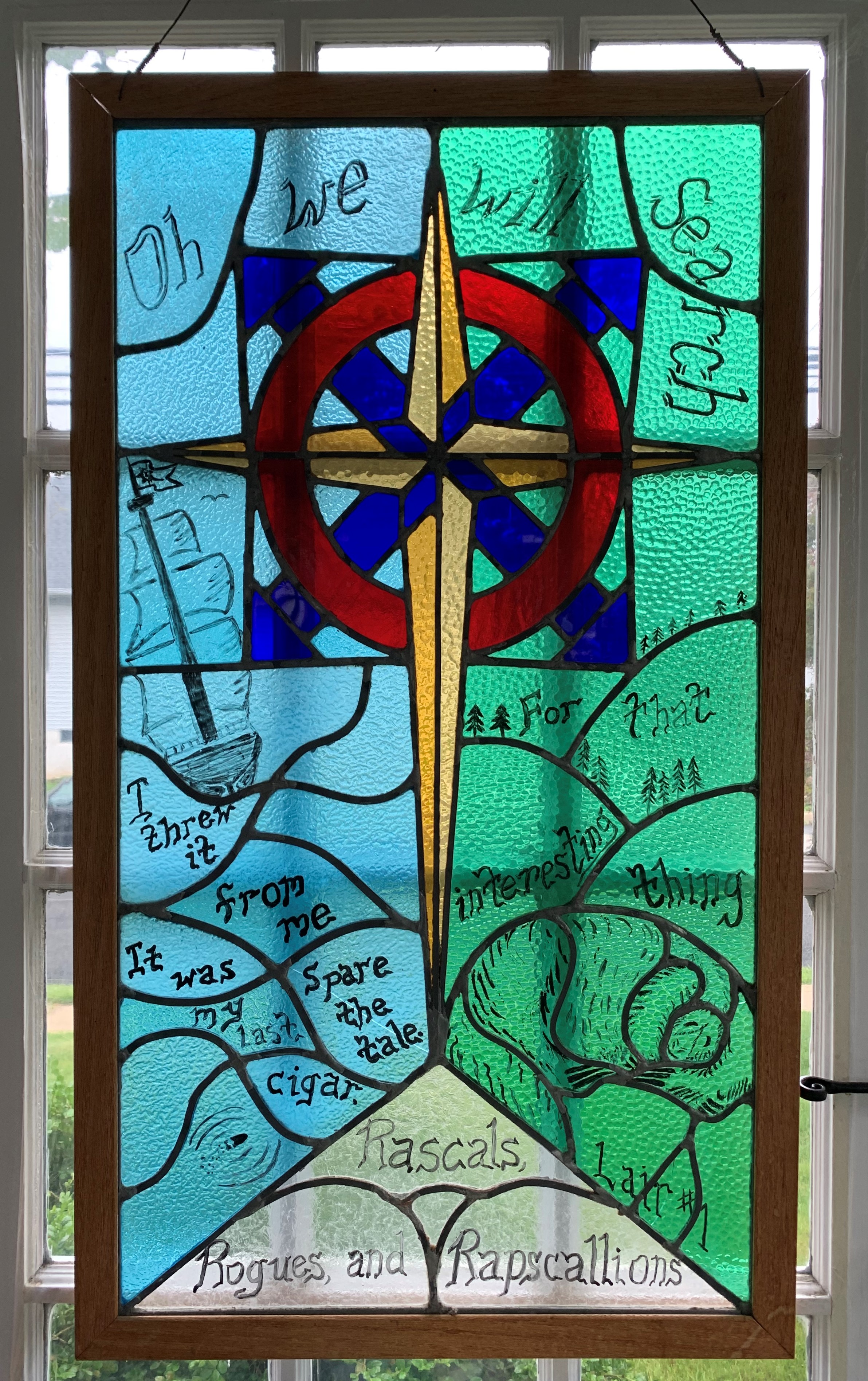 Charlei George revealed his labor-intensive Stained Glass representation of the Rascal Flag (his wife having taught him that mysterious art, redolent of smoke and fire), noting that it was Already Broken. The Lair #1 piece fractured into 3 lairs, and note was made of a uterine shape, for we gave birth to the other Lairs. There is some thought to requiring that this be a window in the sanctuary of every church Dan Morrison is assigned to.
