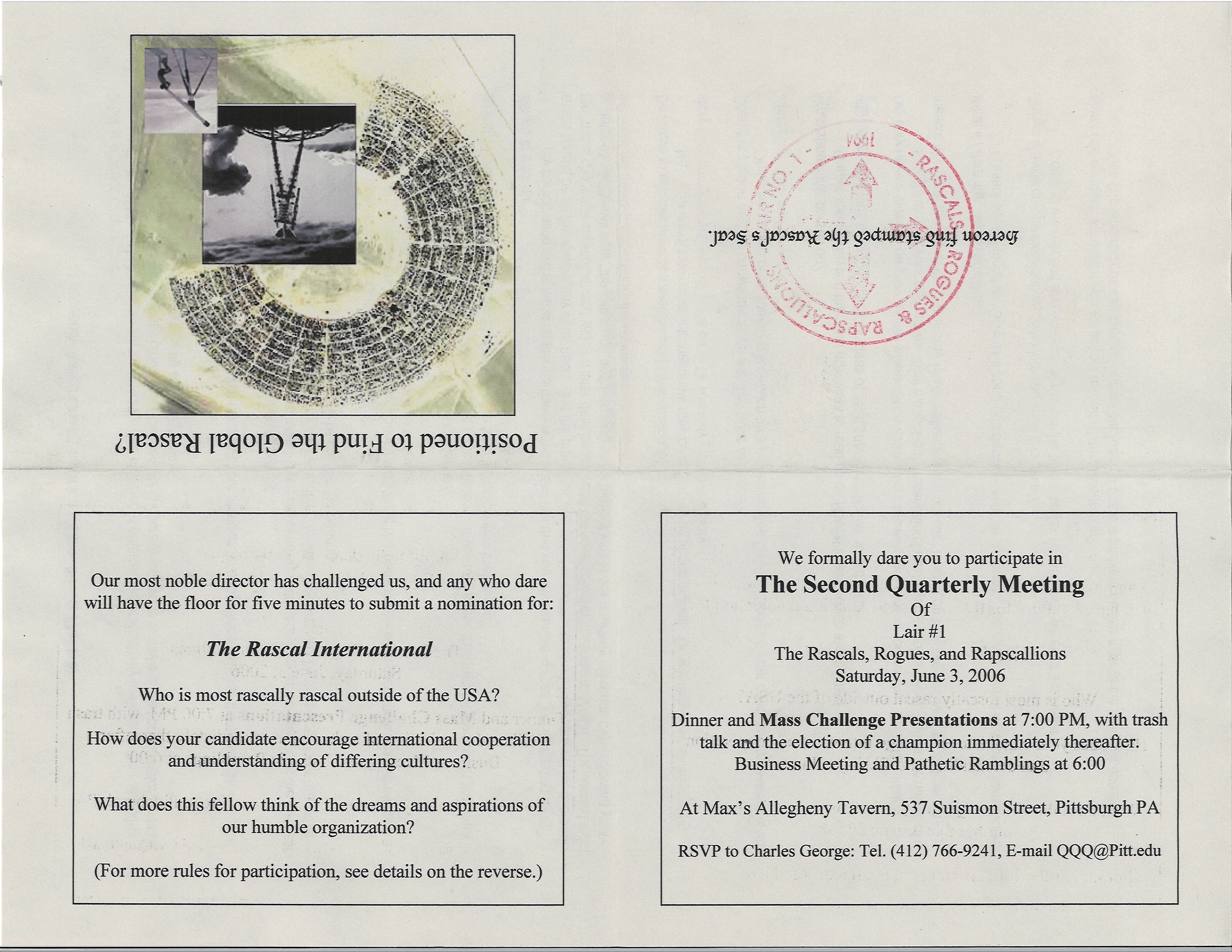 The only information we have about this meeting comes from a copy of an invitation in the Ephorate Archive. The invitation lists the date as June 3, 2006, and the meeting as a Mass Challenge meeting in which the challenge is to identify, "The Rascal International: Who is the most rascally rascal outside of the USA?"