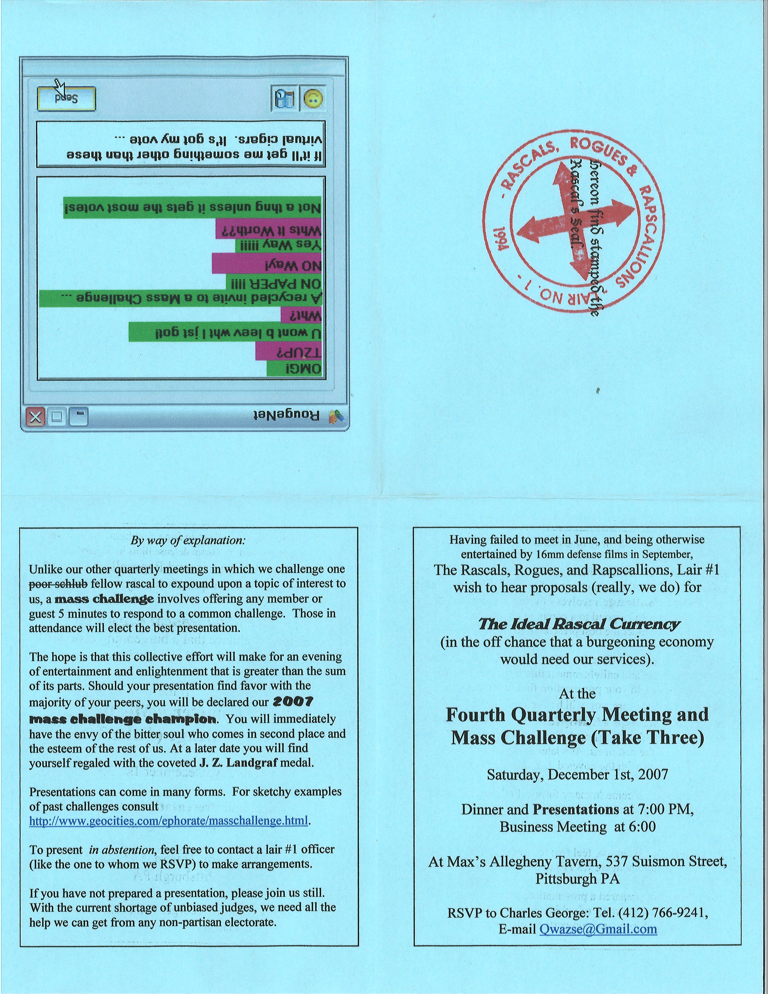Based on emails, we can infer the following account of this meeting is mostly true. It seems Lair No. 1 met on December 1, 2007 for its Mass Challenge, which was to produce a Rascal currency. Timons Esaias won the competition, for his second time. Following is an account by Charles George, reproduced here verbatim. Take it for what it's worth: