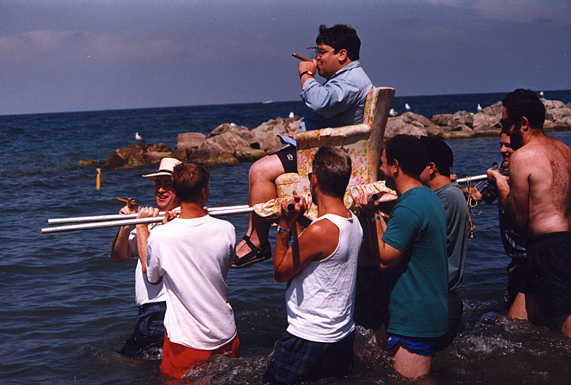 Riding the Rascal o' the Year sedan chair into Lake Erie.