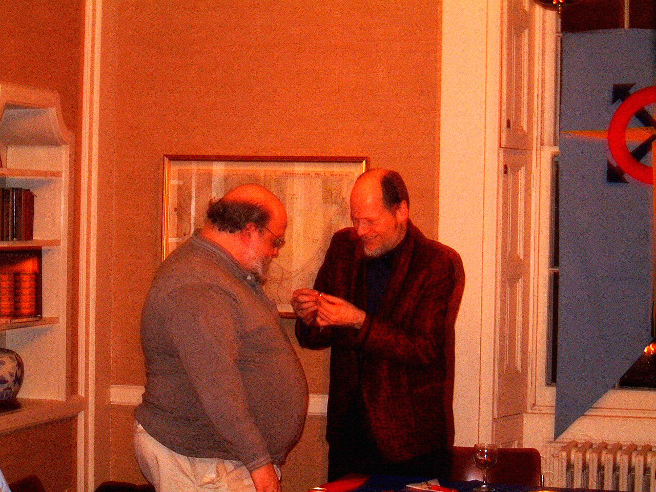 "True to form we had a ball last night in literal and figurative sense. Twenty folks attended. Ron even purchased a pickup truck for the occasion! Folks were not quite as brilliantly colored as last year, but the Latin theme went over well. The advantage of Chatham village is that we could hire our favorite bartender, Vic Norman, who does not nickle and dime customers, unless they're late paying dues. Lee MC'ed and had each of us render an account of our contribution the year's activities. Ron was awarded the Landgraf medal, and thanks to fond memories of Grog, Archives, and Giant Sloths, the Rascal of the Year Award was passed on to him as well. Bob issued the mass challenge: by June, trace the last century of history of your house (or the property on which it stands) and report the interesting thing in five minutes. After dinner, four Latin dance instructors came and taught us to Merenge and Salsa."