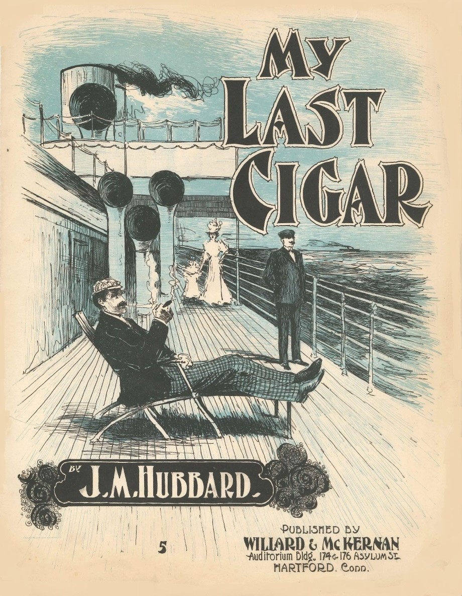 Second, circa 1844, in the environs of Yale College, the 23-year-old James M. Hubbard (1822-1900) met the 17-year-old Charles Condit (1827-1876) who passed off a 32-line version of Fabens's poem as his own and Hubbard wrote some fancy music for it, publishing in New York for the first time the song titled: "Twas off the Blue Canaries, or, My Last Cigar" in 1844
