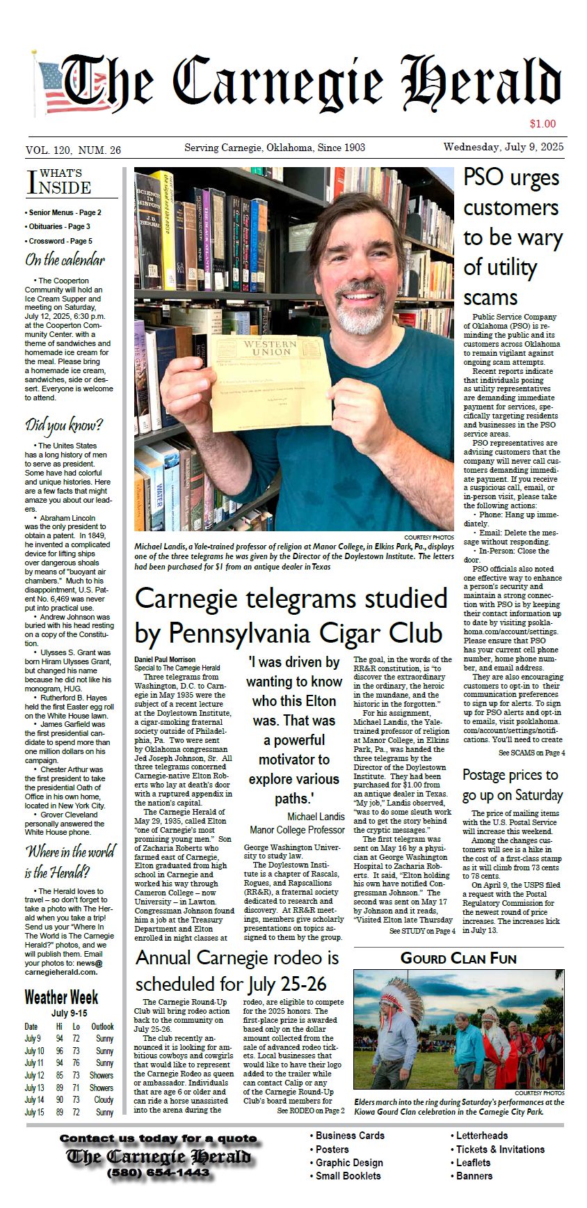 Lair No. 3 of the Rascals, Rogues, and Rapscallions held its second quarter 2025 meeting on Saturday, June 14, 2025, at the Doylestown Maennerchor Society building. The evening's program was Micahel Landis's Rascal Challenge presentation in which he was told to bring back the story of three telegraphs send from Washington, DC, to Carnegie, Oklahoma, in 1935. A few weeks later, the Carnegie (Okla.) Herald published an article about Landis's presentation.