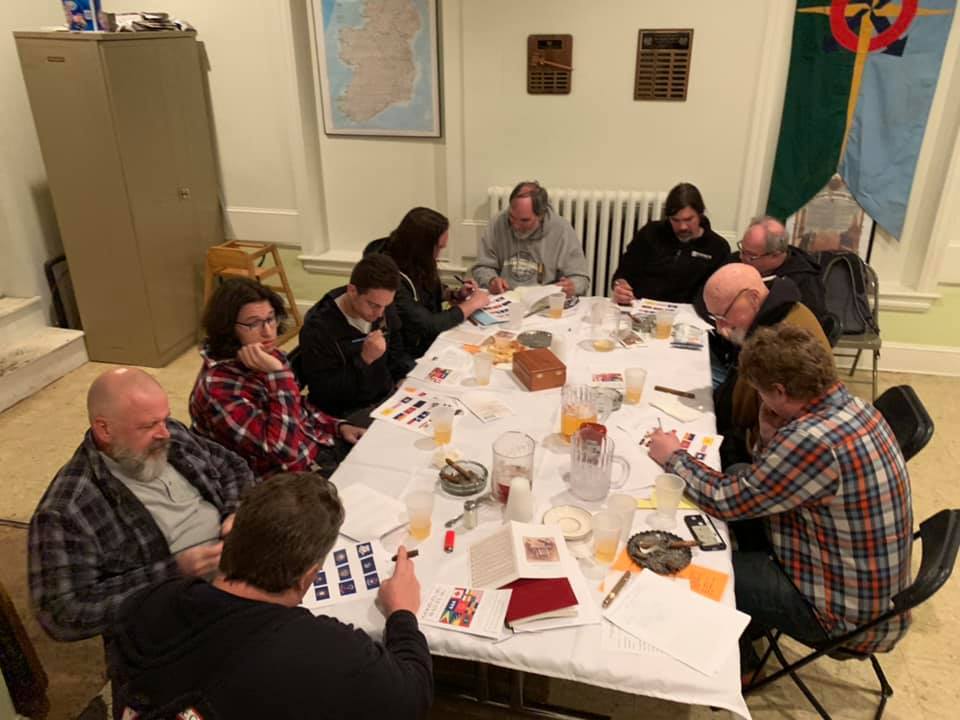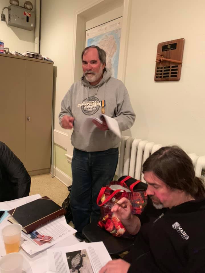 On October 5, 2019, Lair No. 3 of the RR&R gathered at the Doylestown Maennerchor Society for its annual Research Reports meeting. Michael Moscherosch discussed outdoor bread oven design. Jim Barr gave details on a turtle visiting his house. Doug Nolan talked about bonsai cultivation. Ray Hull II presented an array of tree parts curiously deformed. Dan Morrison proposed changing the Pennsylvania state flag. And Ray Hull III discussed UFOs and aliens.