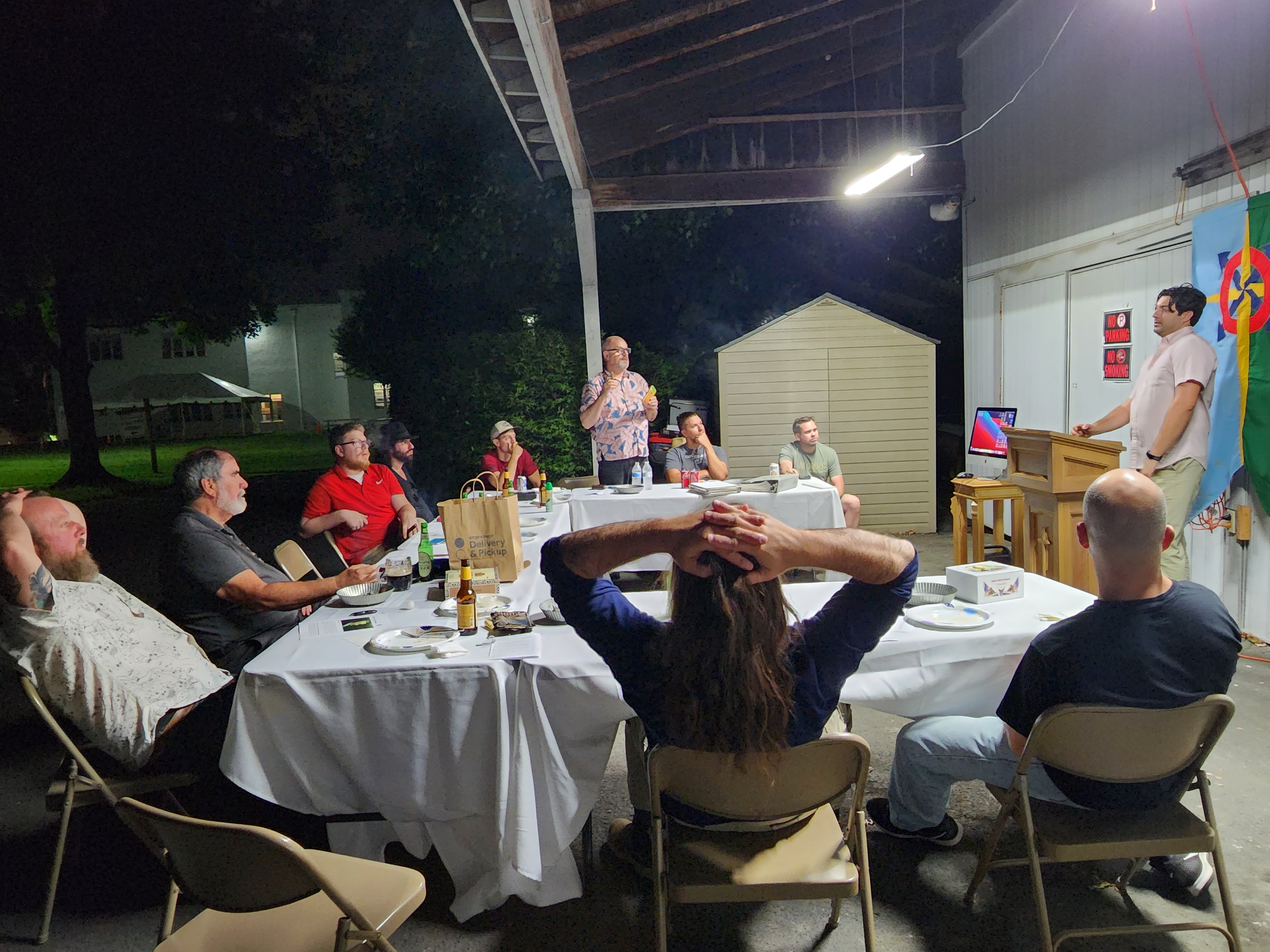Lair No. 3 of the Rascals, Rogues, and Rapscallions held its third quarter 2022 meeting on Saturday, September 10, 2022, at the Huntingdon Valley Presbyterian Church barn. A total of 12 people were present in person and two were online. Guest Rich James kicked off the evening with his slide presentation about escalators. Rogue Hayes Lewis talked about translating an Italian book about the Doge of Venice. Guest Jason Enelow talked about the drinking habits of Queen Elizabeth II and raised the question, “Is the pineapple in the drink an affectation?” Rogue Calvin Morrison talked about a rolodex he purchased at a Goodwill store and proposed identifying its former owner. He also talked about making electronics for his Saab. Rogue Jordan Goretti talked about birdwatching. Rogue Sean McVan talked about old bottles he found in his basement. Rogue Jim Barr talked about the bubbles in Guinness beer. Rapscallion Dan Morrison talked about Ebby Flack, an HVPC choir director featured in a chapter of the dissertation Morrison is writing.