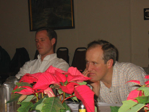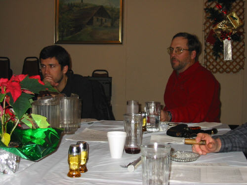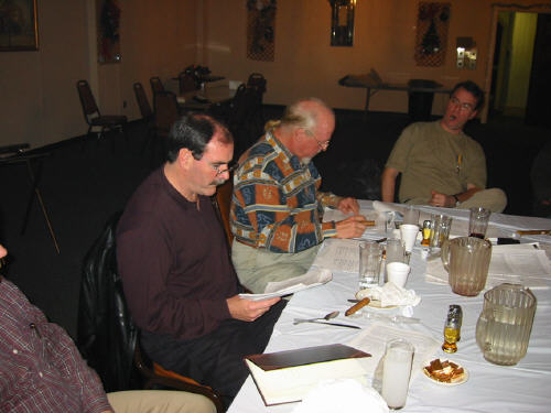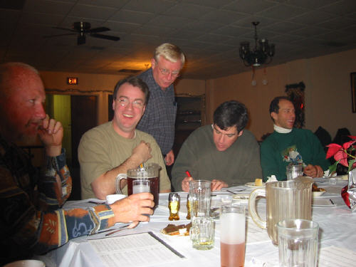 On December 14, 2002, Lair No. 3 of the RR&R met at the Moose Home in Doylestown to prepare for Marino's Follies. Members and friends were invited to present a one-act play or musical offering for consideration as components of Marino's Follies show -- a fund-raiser proposed for Spring/Summer 2003. Among the one-act plays presented during the course of the evening was Michael Moscherosch with his reading of "Same Procedure as Every Year." Ray Hull offered his rendition of Abbott and Costello's "Who's on First?" routine. Tim Tracy proved himself to be a nuanced reader and presented some play or other, the title of which eludes this writer at this time. Jim Barr presented a play about a washed up barrister. Karl Halter did a reading of "The Philadelphia," which was well received. Dan Morrison offered a reading of "Out the Window," a play published in 1964 in Cody, Wyoming. The dramatic highlight of the evening was the reading of "Seeds of Glory," an original play written by the Rascal's own Peter Marino. A variety of musical numbers were also proffered, beginning with David Currie's rousing rendition of Tennessee Ernie Ford's "Sixteen Tons," a song which we learned the FBI had attempted to keep from the airwaves of America because of its labor sentiments. Dan Krewson led the group in a stirring Hobbit drinking song, sung as a round, which was, without doubt, the most appreciated bit of music in the entire evening. Dan Morrison was ably assisted by Gary Frazier and David Currie in two numbers: "Down at the Licensed Saloon," a heart-rending song about the perils of alcohol, published in 1892 by supporters of Prohibition, and "A Woman is Only a Woman," written by Victor Herbert, one-time director of the Pittsburgh Symphony Orchestra. Falling into the "other" category was Matt Schultz who juggled dinner rolls and recited the periodic table.