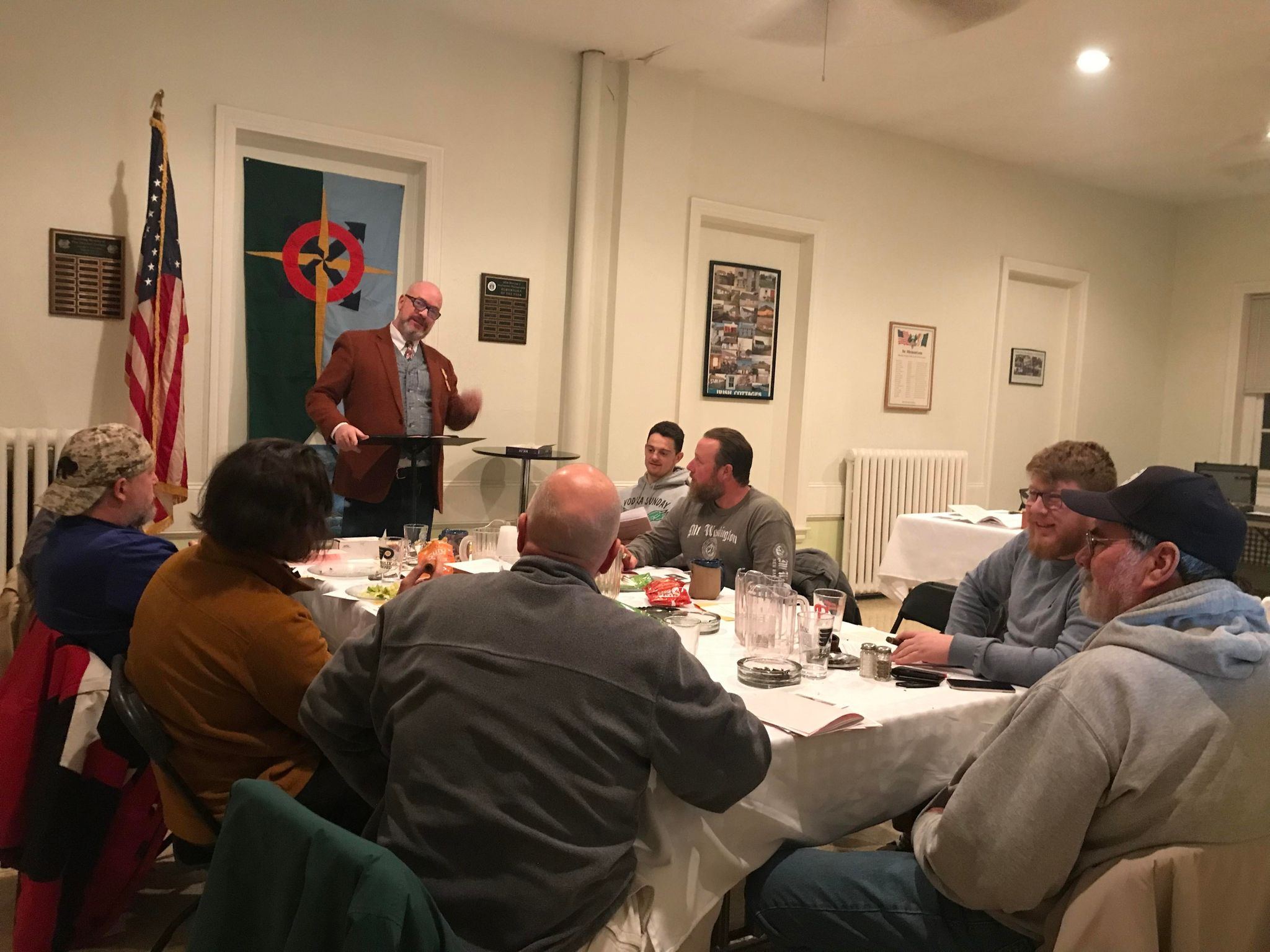 Second Rogues Dinner, Doylestown Maennerchor Society, January 12, 2022. Clockwise from speaker: Dan Morrison, Sean McVan, Roger Hull, Calvin Morrison, Jim Barr, Michael Moscherosch, Leon Moscherosch, Ray Hull, Dan Bramer (obscured). Also present at the meeting and taking this photograph was William Moult.