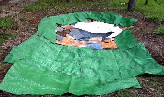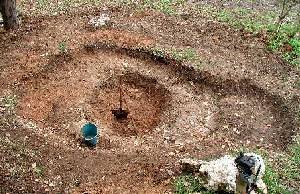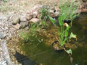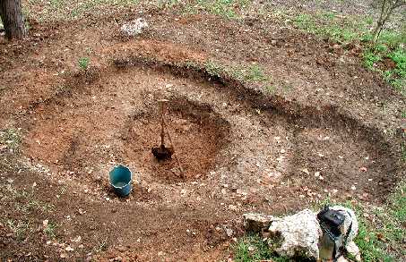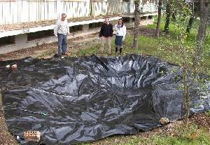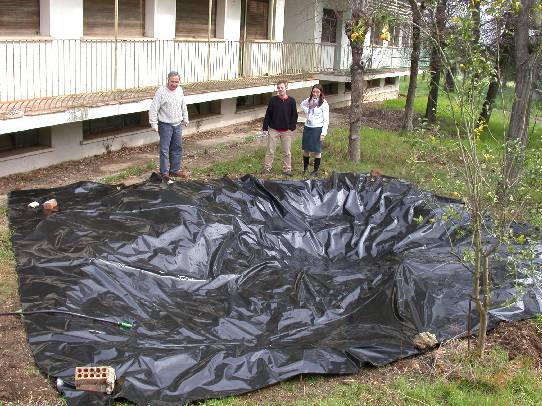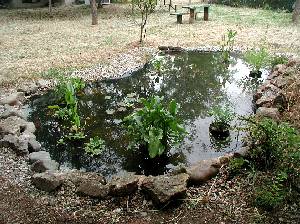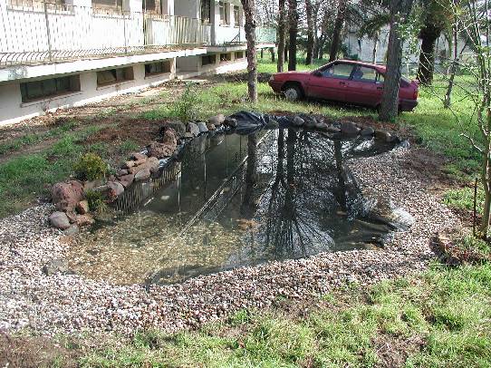 Excavación manual. Fondo "alisado" y cubierto con una capa de protección. Impermeabilización con doble capa de plástico agrícola (0'56 € /m2). Orillas rematadas con piedras y con grava.