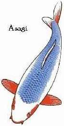 ASAGI: vientre y aletas rojo anaranjado, dorso azul pálido. SHUSUI: como ASAGI, pero con escamación DOITSU (tipo carpa de espejos).