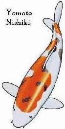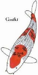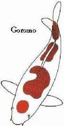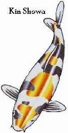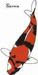 | SHOWA (o SHOWA SANSHOKU): blanco, rojo y negro, que es dominante en el Showa antiguo. Negro en la cabeza (en forma de rayo "inazuma", o bien en forma de V; etc.). Negro en la base de aletas pectorales. Cola blanca. Los modernos Kindai Showa tienen menos negro y más blanco. La razón más probable de esta evolución es que la mayoría de los estanques modernos para Kois están terminados en color (interior) negro. Contra este fondo, un Showa antiguo con grandes manchas negras es menos vistoso. Es frecuente que el SUMI (negro) se vuelva más intenso y se extienda en los Kois de esta variedad a medida que maduran. |
