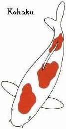 blanco nieve (SHIRO), con manchas rojas (HI) grandes y bien definidas, y pequeñas manchas negras (SUMI). Este no debe aparecer en la cabeza. Aletas pectorales y cola mejor con rayas negras. Tanto en Showas como en Sankes, el patrón del Hi (rojo) es muy importante. Si imaginásemos al pez sin las manchas negras, debería tener un buen patrón de Kohaku.
