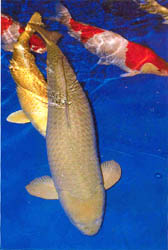 se trata de algo más que una simple variedad de Koi, ya que son un tanto diferentes morfológicamente. Son de color marrón verdoso uniforme, presentan un crecimiento muy rápido , superior a las restantes variedades, y llegan a alcanzar más de un metro de longitud (foto de una campeona de 135 cm!). Son además muy dóciles. La simplicidad de su colorido se ve compensada por su impresionante talla. |