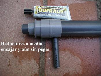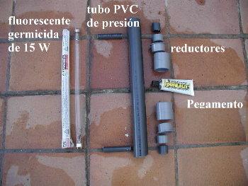 Componentes y Precio, en pesetas 1 m tubo PVC presión 50 mm =195 1 m tubo PVC presión 20 mm = 75 2 Tes 50 mm x 87 = 220 2 reductores 50 a 40 mm =190 2 reductores 40 a 32 mm = 150 1 tubo pegamento para PVC=180 fluorescente Philips TUV 15 W 2.475 ptas la reactancia, cebador, fichas de conexión, cable, cuestan muy poco
