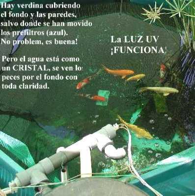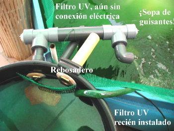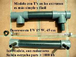Se trata de alojar un fluorescente ultravioleta germicida en el interior de un tubo de PVC, sellando los extremos con una pistola térmica de silicona. Los casquillos metálicos del fluorescente han de quedar por fuera. El agua procedente de filtro debe entrar por un extremo del tubo, circular alrededor del fluorescente, y salir por el extremo opuesto de vuelta al estanque.