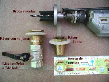 Componentes, y Precio en pesetas 2 barriles basura de 90 litros = 2 x 2.000 = 4.000 1 m tubo PVC presión 32 mm =125 6 rácor de depósito de 1" = 6 x 225= 1.350 6 juntas cónicas = 6 x 50 = 300 3 manguitos presión 32 mm = 3 x 75 = 225 2 codos presión 32 mm = 2 x 85 = 170 2 reductores 40 a 32 mm = 150 1 unión de tres piezas, 32 mm = 285 1 rollo de teflón = 50 1 tubo pegamento para PVC=180 |