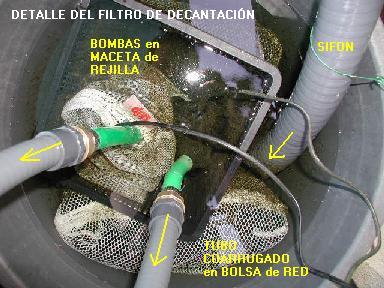 He colocado lass dos bombas en un primer filtro de decantación para así poder conseguir más altura de agua en los dos filtros de barril que siguen, y por tanto más volumen de filtración. |