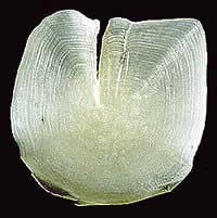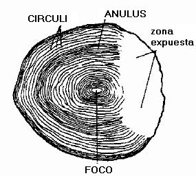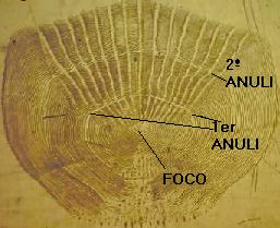 | Imagen de una escama preparada, obtenida con una fotolupa. A partir del FOCO se disponen múltiples CIRCULI. Forman tres bandas separadas entre sí por dos ANULI. El primer ANULUS marca el final de la 1ª estación de crecimiento, y el segundo marca el final de la 2ª estación de crecimiento. La banda exterior de CIRCULI corresponden a la tercera estación de crecimiento. El pez fue capturado en otoño, y tiene por tanto 2 años aún. |