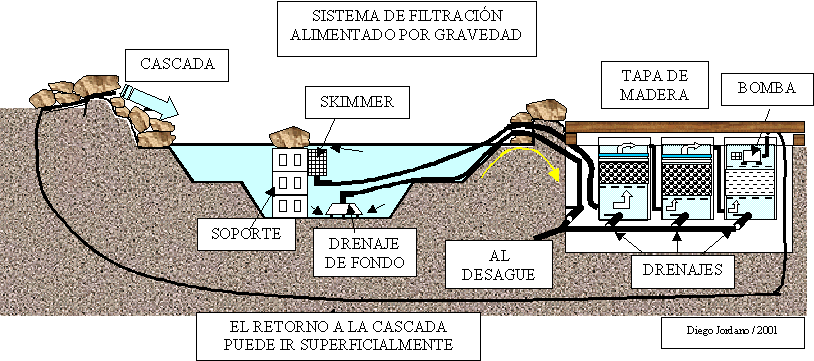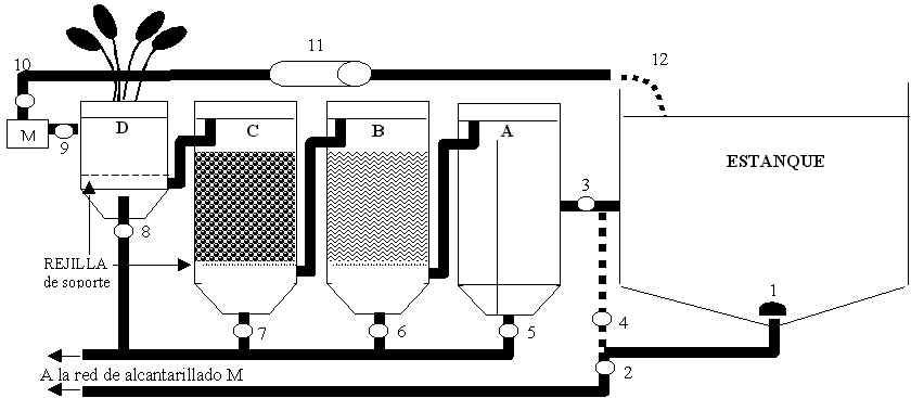 El drenaje de fondo (1) nos permitirá eliminar periódicamente agua del fondo cargada de detritus y sedimentos con sólo abrir la válvula 2. El sistema de filtración irá anexo al estanque, al mismo nivel. El agua circula por gravedad a través de la salida lateral (3), y opcionalmente por el drenaje 1, pasando secuencialmente a través de la cámara de sedimentación (A), de filtración mecánica (B) y biológica (C). Se suelen disponer difusores de aire en el fondo. Opcionalmente pasará por un filtro verde (D) con plantas acuáticas que asimilan nitratos y fosfatos. El diseño de la conexión entre cámaras (entrada baja, salida alta) ayuda a evitar el paso de impurezas, y aumenta la aireación del agua (efecto whirpool). Después el agua es impulsada por una bomba (M) situada al final del sistema, protegida de partículas que la podrían bloquear o dañar. El agua pasa entonces a través del filtro de luz ultravioleta (11), que eliminará las algas que provocan la coloración verde del agua, así como gérmenes patógenos. Finalmente el agua vuelve al estanque a través de una pequeña cascada (12), o bien de un venturi, que contribuyen a su oxigenación. Las llaves 9 y 10 facilitan las operaciones de mantenimiento y sustitución de la bomba en caso de avería. Para estanques grandes esto es infinitamente mejor que colocar una bomba sumergida.