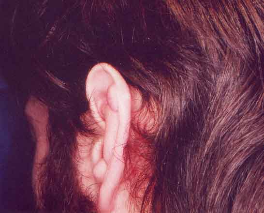 Figs. 4, 5, 6:- Paciente masculino de 25 años de edad con una curación hipertrófica tipo queloide en la zona del hélix descendente de la oreja izquierda posterior a la transfixión en la fosa escafoidea para colocar un peqeuño aro y que se complicó con infección. Se trató con antibióticos vía oral en su momento y después, comienzó con el proceso anormal de su cicatriz. Fue intervenido quirúrgicamente, se le dejaron capitones para evitar formación de hematomas, inició presoterapia y después de retirados los puntos se continuó con una pequeña placa de silicona en la misma zona. Con este tratamiento no hubo recidiva. No hubo necesidad de aplicar corticoides. Este paciente tuvo una herida en la rodilla derecha -años atrás- que nunca presentó cicatrización anormal. (Fotos tomadas por el autor)