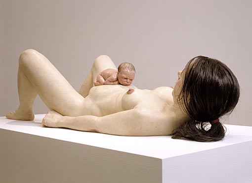 Escultura hiperrealista por Ron Mueck, de una mujer que da a luz felizmente a su bebé.