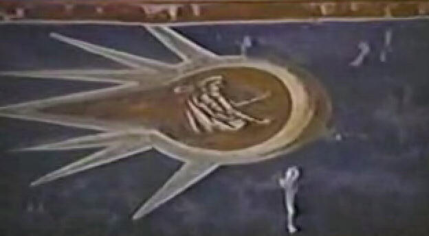 ángeles horrorizados en los cielos se tapan los oidos del estruendo.
