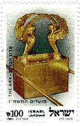 Emisión postal israelita de una serie dedicada a conmemorar el nuevo año judío correspondiente al 1985 y que ilustrando varios objetos del mobiliario del tabernáculo, este valor de 100 Siclos nos muestra esta hermosa arca de la Alianza de oro puro, con dos bellos seres alados o Kerubs.