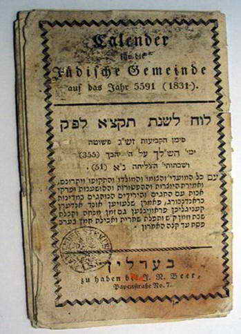 "Calendario de la comunidad judía alemana" para el año 5591 (1831), que incluía "todas las festividades, ayunos y plegarias, así como las ferias de los estados de Brandenburgo y Silesia" - Berlín, 1831