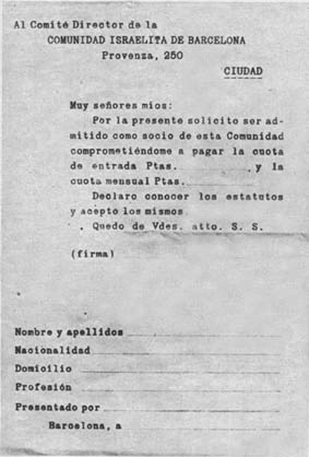 Siguiendo la tradición de su raza la mayoría de esta comunidad se dedico al comercio, según sus posibilidades económicas e intelectuales. Existen hebreos dueños de grandes almacenes y vendedores ambulantes de corbatas y cinturones. Muchos de los "mogoles" de las casas cinematográficas en España son Israelitas. Estos hombres apenas han tenido relación con el resto de la colonia Judaica. En todo caso, sus mujeres o sus hijas forman parte de la sociedad Beruria, que es una especie de "ropero". Pero de todos modos, aunque oficialmente no se traten con sus hermanos de raza, ni frecuenten la sinagoga no permanecieron sordos a la llamada de la Comunidad. La Comunidad Israelita de Barcelona es una de las sociedades que sirven de vínculo entre los hebreos que viven en la ciudad, y el ingreso se solicita en esta forma. (Foto a la izda.)Se calcula que para enero de 1935 había unos veinte mil, sefarditas en su mayoría en toda España. En Cataluña seguramente habría entre siete o ocho mil y el resto estaba dividido en toda España; pero especialmente por la ciudades marítimas. Tan solo existían dos comunidades sefarditas en la Península: La de Barcelona la más importante, y la de Madrid.