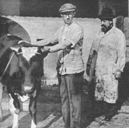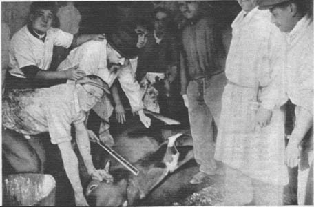 Esta otra curiosísima fotografía representa el momento en que el propio rabino Kimstlinger se dispone a sacrificar un novillo.