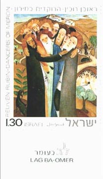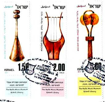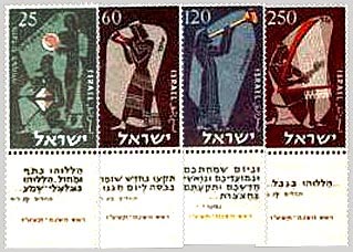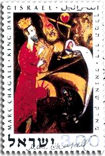 El rey David tañendo una Kinor en una pintura de Marc Chagall. Este sello tiene la peculiaridad de estar firmado por el mismo Chagall en 1969, mientras que la serie emitida para el correo israelí ordinariamente no llevaban firma alguna.