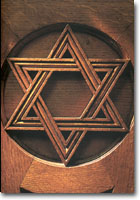 "La maguen David o Estrella de David, místico símbolo de la conjunción de lo divino con lo humano y ligada con el estado de Israel y el judaísmo.El Emperador Carlos IV otorgó en el año 1357 al ayuntamiento de Praga ell privilegio de implantar una bandera con la Estrella de David. Desde aquí el emblema empezó su recorrido por Europa."