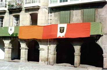 Praza do Concello engalanada de escudos medievais e xudeus como o que se pode ver cunha menorá dourada sobre fonde negro